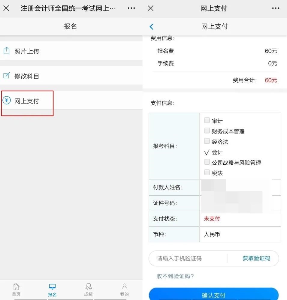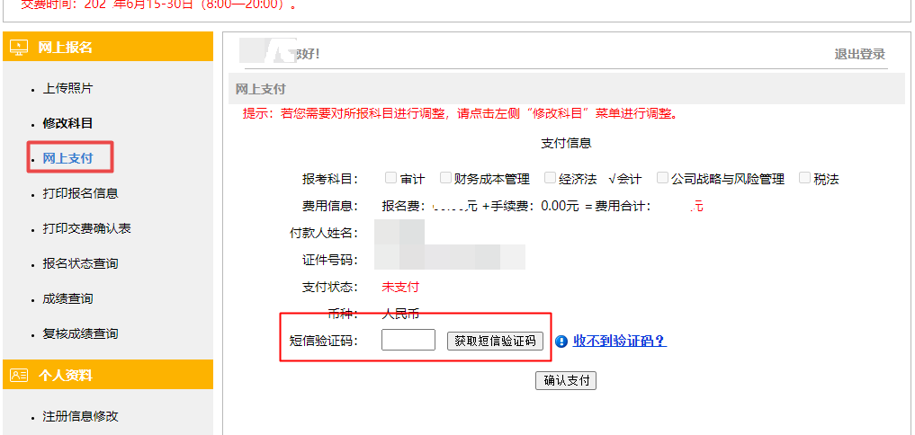 2.如无需调整报名科目的,直接点击“网上支付”,核对报名科目和费用信息,获取手机短信验证码并输入后,点击“确认支付”进入交费页面,选择支付方式,按流程进行支付即可。